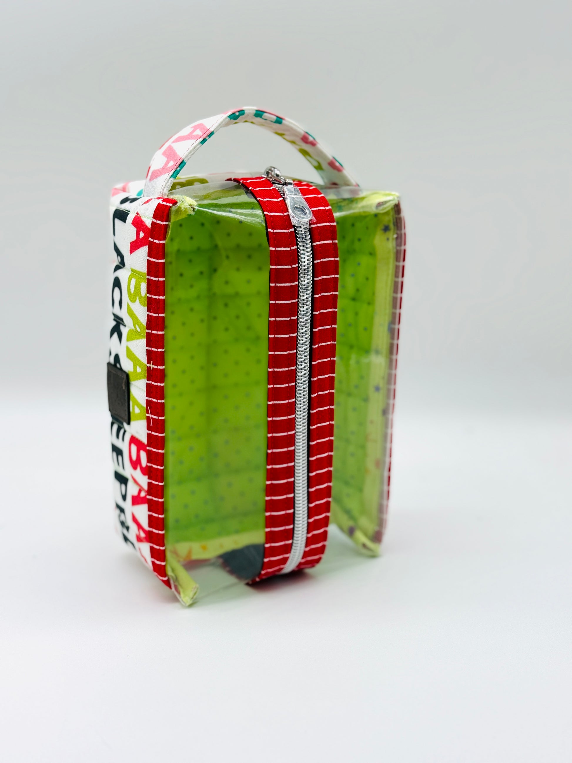 The Box Bag 2.0 size small is quilted boxy pouch with a fun vinyl window to see the contents inside. Perfect to carry your latest project